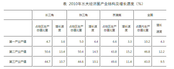 三大經(jīng)濟圈中,2010年三次產(chǎn)業(yè)增長速度均超過全國平均水平的有幾個?